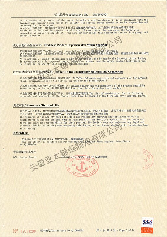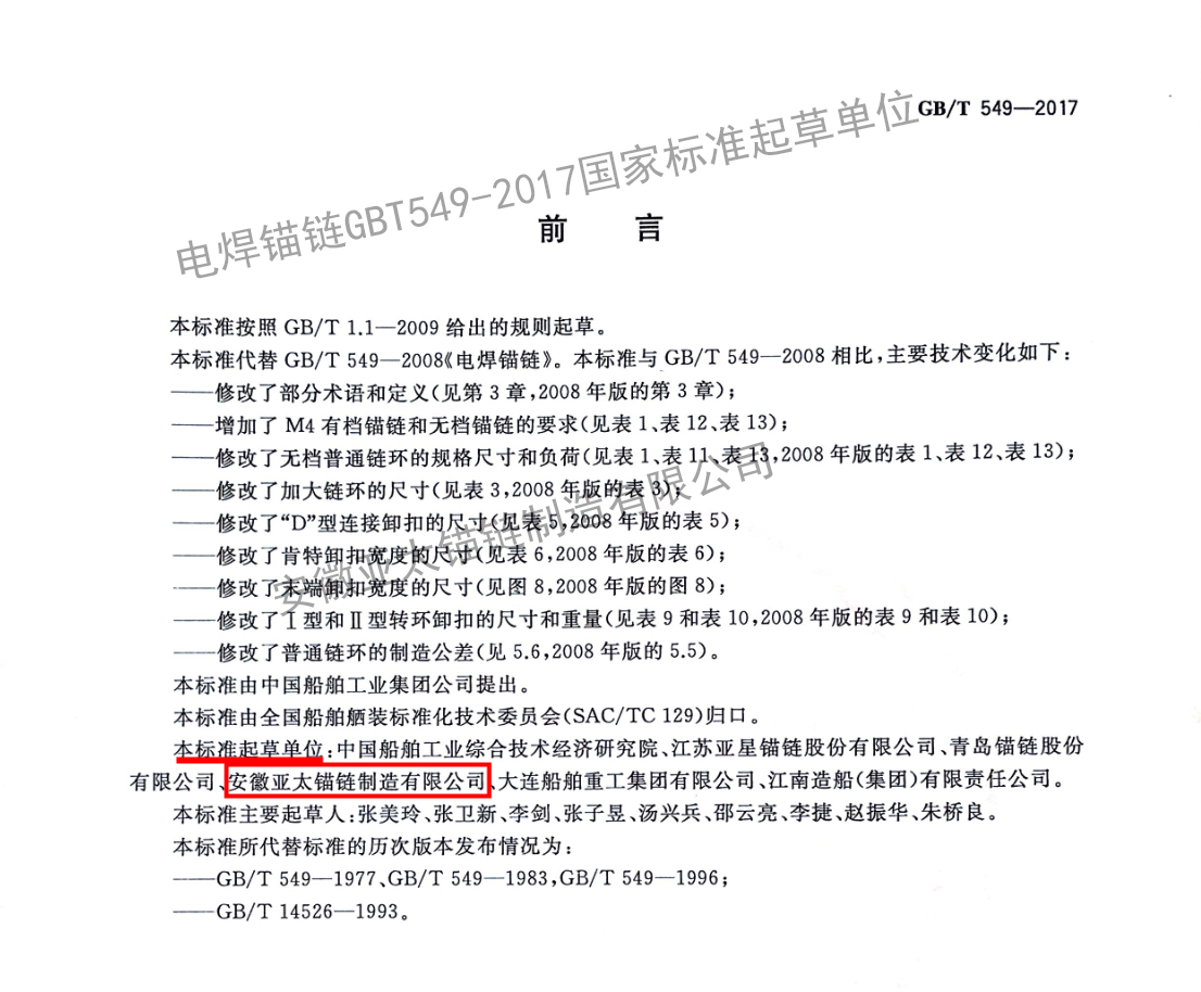 安徽亞太錨鏈制造有限公司是國家高新技術企業,也是國家GB/T 549-2017《電焊錨鏈》標準的起草和制定單位之一。公司旗下設有錨鏈分廠、浮標分廠、舾裝件分廠等多個分廠。公司專業從事φ12.5mm-φ107mm二、三級船用錨鏈、浮標錨鏈、錨鏈附件,錨、船舶曬裝產品、航標、系船浮、船型標、多種規格海洋監測浮標及航標燈等產品的生產、安裝和服務。目前公司的產品銷往全國各地船廠、碼頭、航標處、航道局、海洋局,并已走上國際市場,如東南亞、中東、歐美等國家。